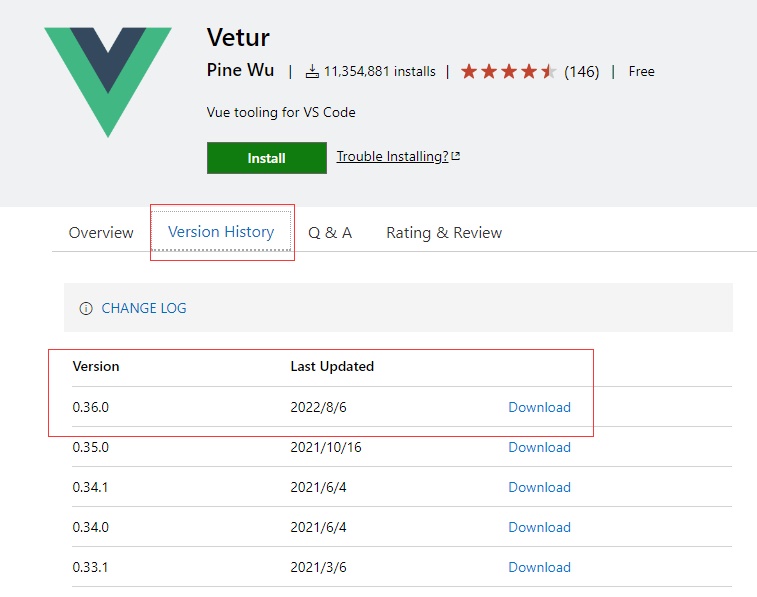 VSCode的插件是后缀为vsix的文件,曾经VSCode是提供插件历史版本下载的。点击“Version History”可见多个历史版本的下载链接。